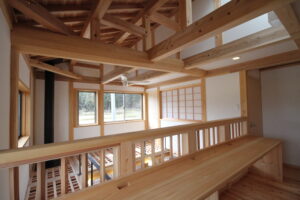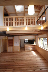 田園に建つ周囲とマッチした家づくりです。室内は薪ストーブと大きな吹き抜けのある大きな空間です。