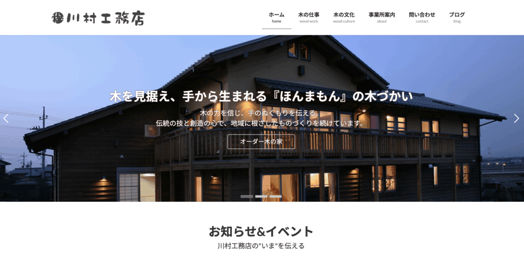 川村工務店としての「木の仕事」と、「木の文化」を伝える活動が、より伝わりやすくなるよう意識して構成しています。