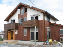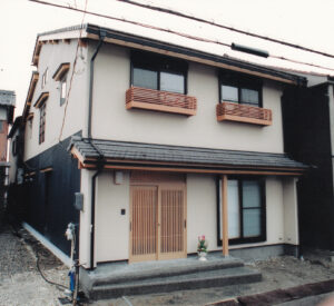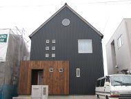 庇のない建物、四角い建物が続く家並みの中で、ひときわとんがった屋根を持っています。居間は大広間ですが、二階とを仕切るアクリルの建具天井が仕込まれています。