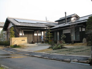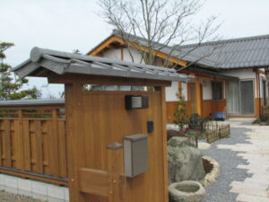 田園に建つ、広々とした平屋の建物です。板塀に囲まれ日本庭園を望む、穏やかな住まいです。