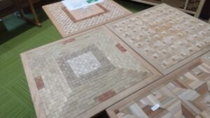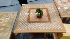 多品種少数小径木という使いにくい材料を、厚さ7㎜の材料に加工し、デザインすることで面白いテーブルが出来ました。天板は750㎜各程度です。